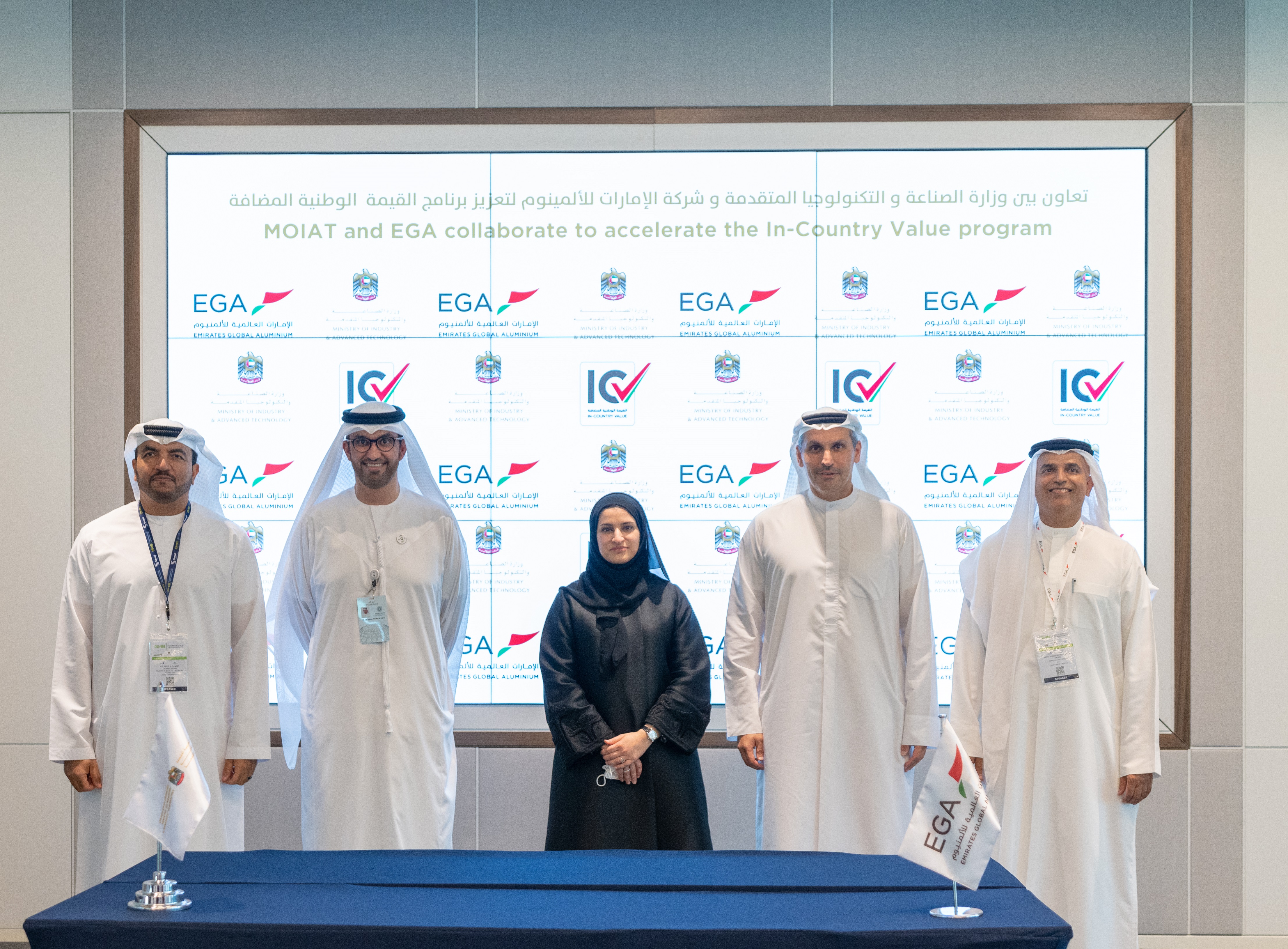In the presence of His Excellency Dr. Sultan Al Jaber, Minister of Industry & Advanced Technology and His Excellency Khaldoon Al Mubarak, Chairman of the Board of Emirates Global Aluminium, His Excellency Omar Suwaina Al Suwaidi, Undersecretary at the Ministry of Industry & Advanced Technology, and Abdulnasser Bin Kalban, Chief Executive Officer of EGA, signed a memorandum of understanding (MoU) regarding the implementation of the In-Country Value Program.