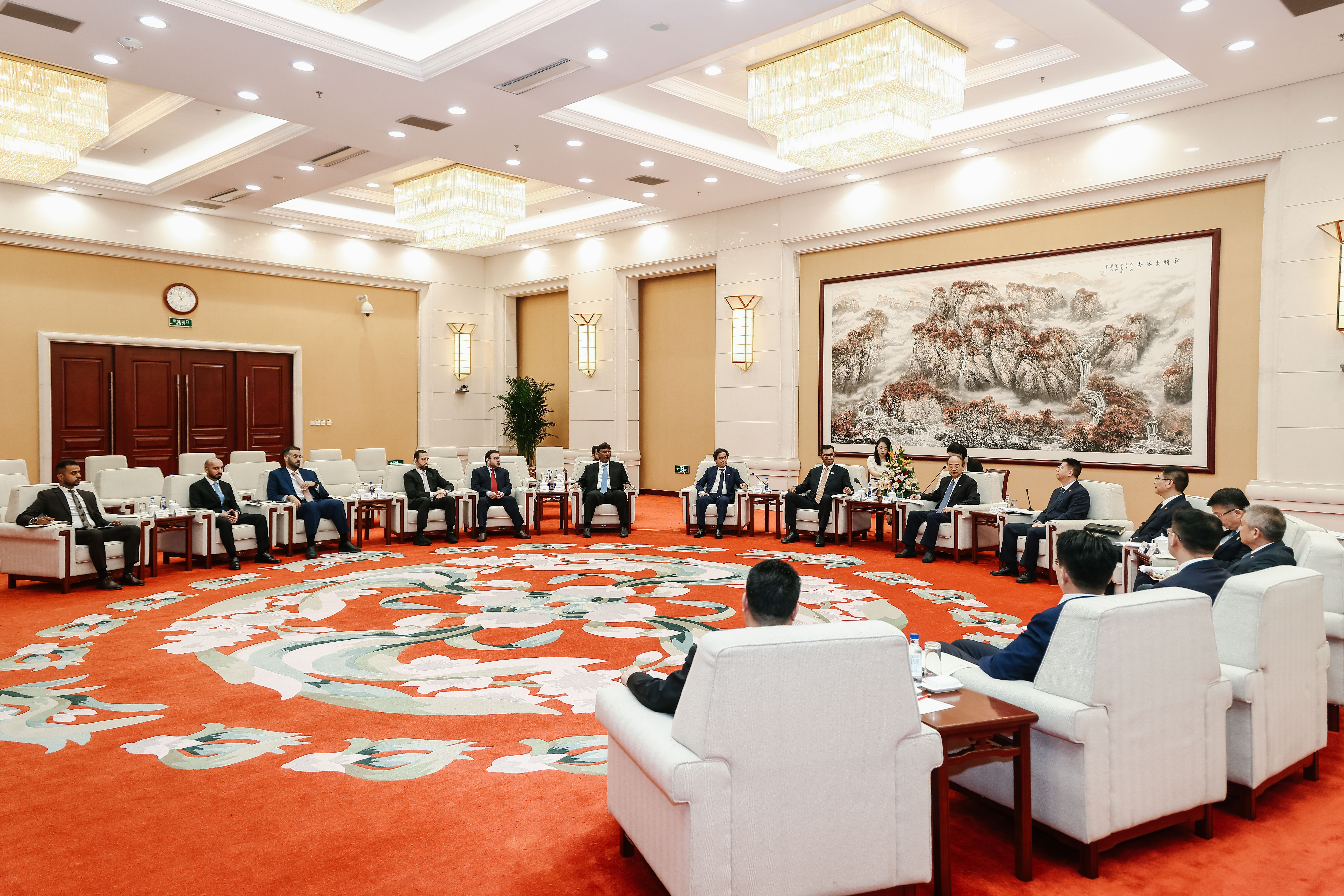التقى معالي الدكتور سلطان الجابر خلال الزيارة كل من دينغ شيويه شيانغ، نائب رئيس مجلس الدولة الصيني، وتشاو تشن شين ، نائب رئيس اللجنة الوطنية للتنمية والإصلاح (NDRC) وسعادة شواندي وو عمدة مدينة فوزهو وذلك بحضور معالي حسين إبراهيم الحمادي، سفير دولة الإمارات لدى جمهورية الصين الشعبية. ونقل معاليه تحيات القيادة في دولة الإمارات وتمنياتها لجمهورية الصين الشعبية قيادةً وحكومةً وشعباً بمزيد من التقدم والازدهار. كما بحث الجانبان سبل تعزيز التعاون والشراكة بين البلدين في عدد من المجالات الحيوية تضمنت: النفط والغاز، والبتروكيماويات، والطاقة المتجددة، وتصنيع الألواح الشمسية، والخدمات اللوجستية، والشحن، والتخزين، وغيرها.
