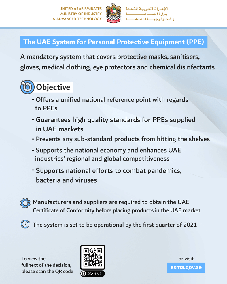 وسيلبي النظام الإماراتي لمنتجات الحماية الصحية الشخصية احتياجات القطاعات الصحية والخدمية والجهات المعنية بتقييم المطابقة والجهات الرقابية، وذلك بما يعزز فعالية وكفاءة جهود التصدي للجوائح والفيروسات ويسهم في تسريع التعافي لمرحلة ما بعد "كوفيد-19" وفق أفضل المعايير العالمية.