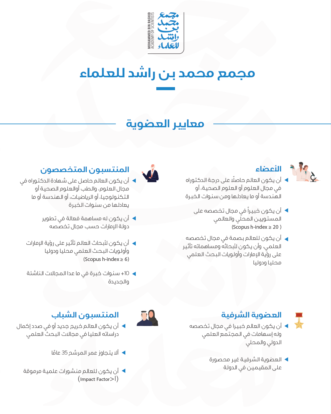 وانتهت فترة تقديم طلبات العضوية منتصف شهر يونيو من العام الماضي، وتم تقييم الطلبات من قبل لجنة الاختيار، ثم رُفعت القائمة النهائية إلى مجلس علماء الإمارات للموافقة عليها، حيث تقوم لجنة من العلماء المتخصصين بدراﺳﺔ ﻛﺎﻓﺔ الطلبات وفقًا لآليات وﻣﻌﺎﻳﻴﺮ محددة تم تطويرها استنادًا إلى المقاييس الببليومترية وﻣﺆﺷﺮ اﻟﺒﺎﺣﺚ الإماراتي.