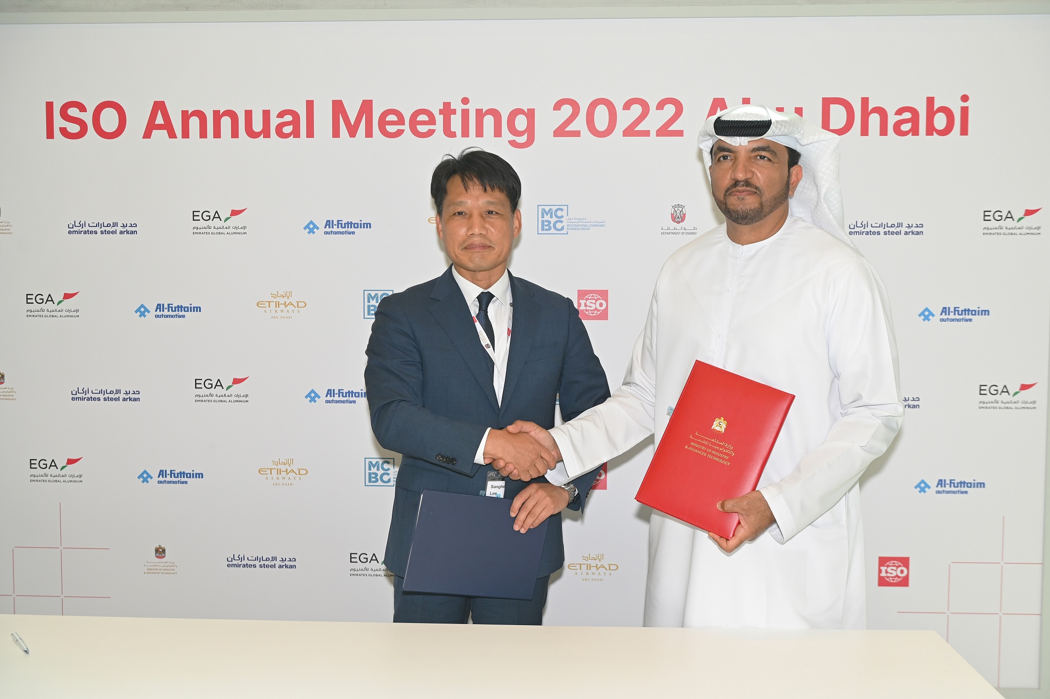 His Excellency Omar Al Suwaidi, Undersecretary of the Ministry of Industry and Advanced Technology signed the MoU on behalf of MoIAT, while Sanghoon Lee, Administrator of KATS, signed for KATS, at the Annual Meeting of the International Organization for Standardization (ISO) 2022, which takes place in Abu Dhabi this week.